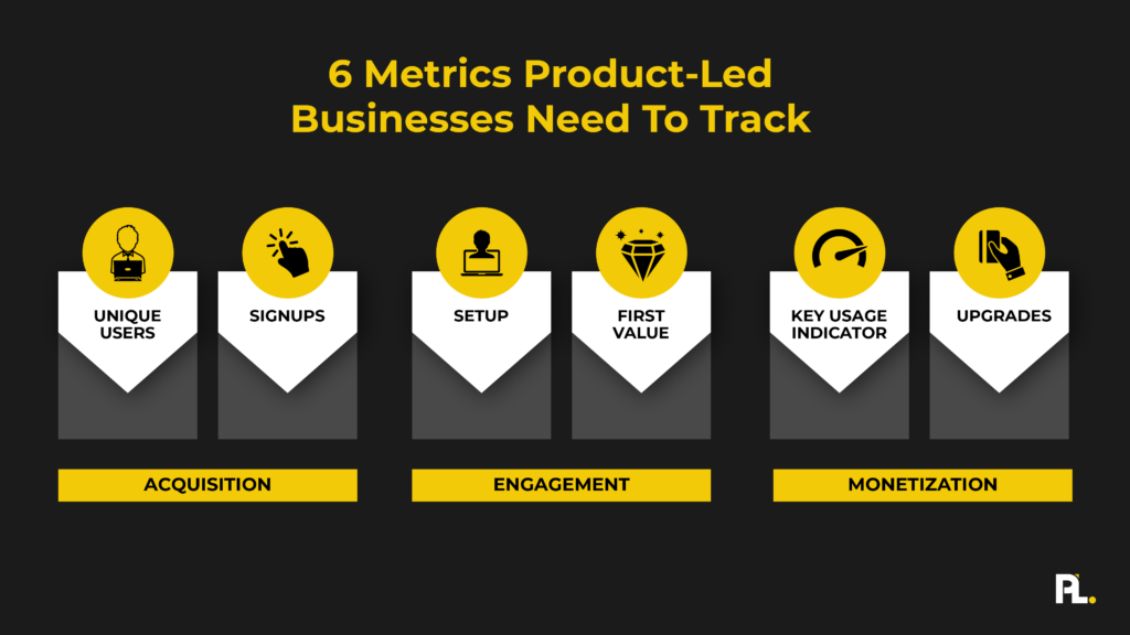 I don't want that to happen to you. By monitoring six metrics, you're going to have clarity about where you should focus in the business. They cover every stage of the customer lifecycle – acquire, engage, monetize – in a product-led business.