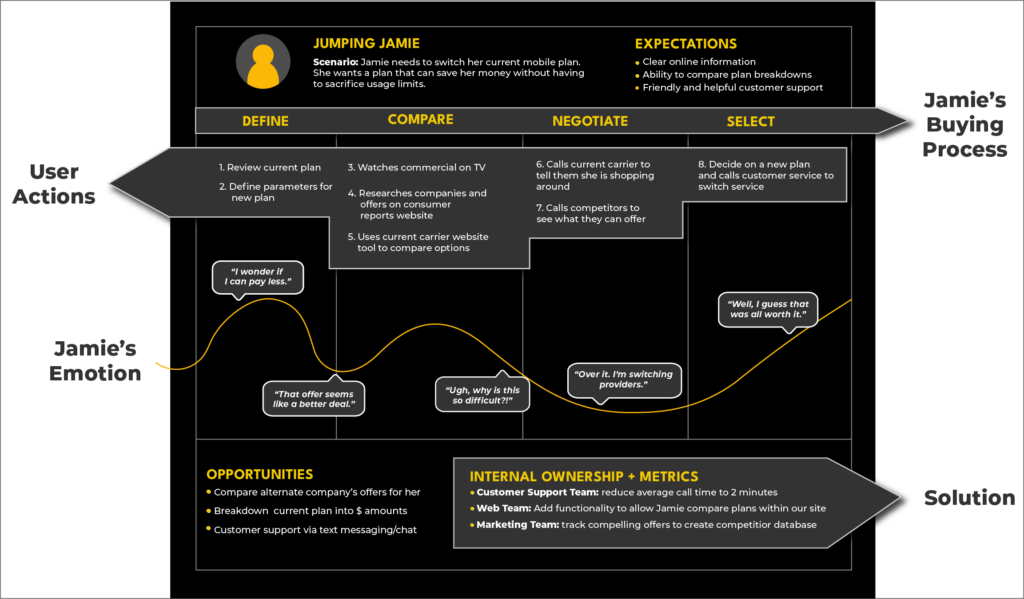 The graphic below shows Jamie’s journey as she explores alternative cell plan options to save money without compromising data usage limits.